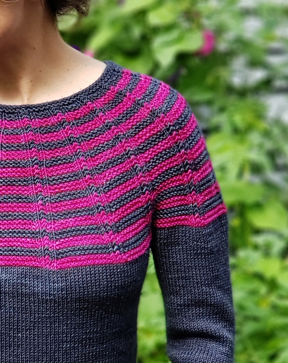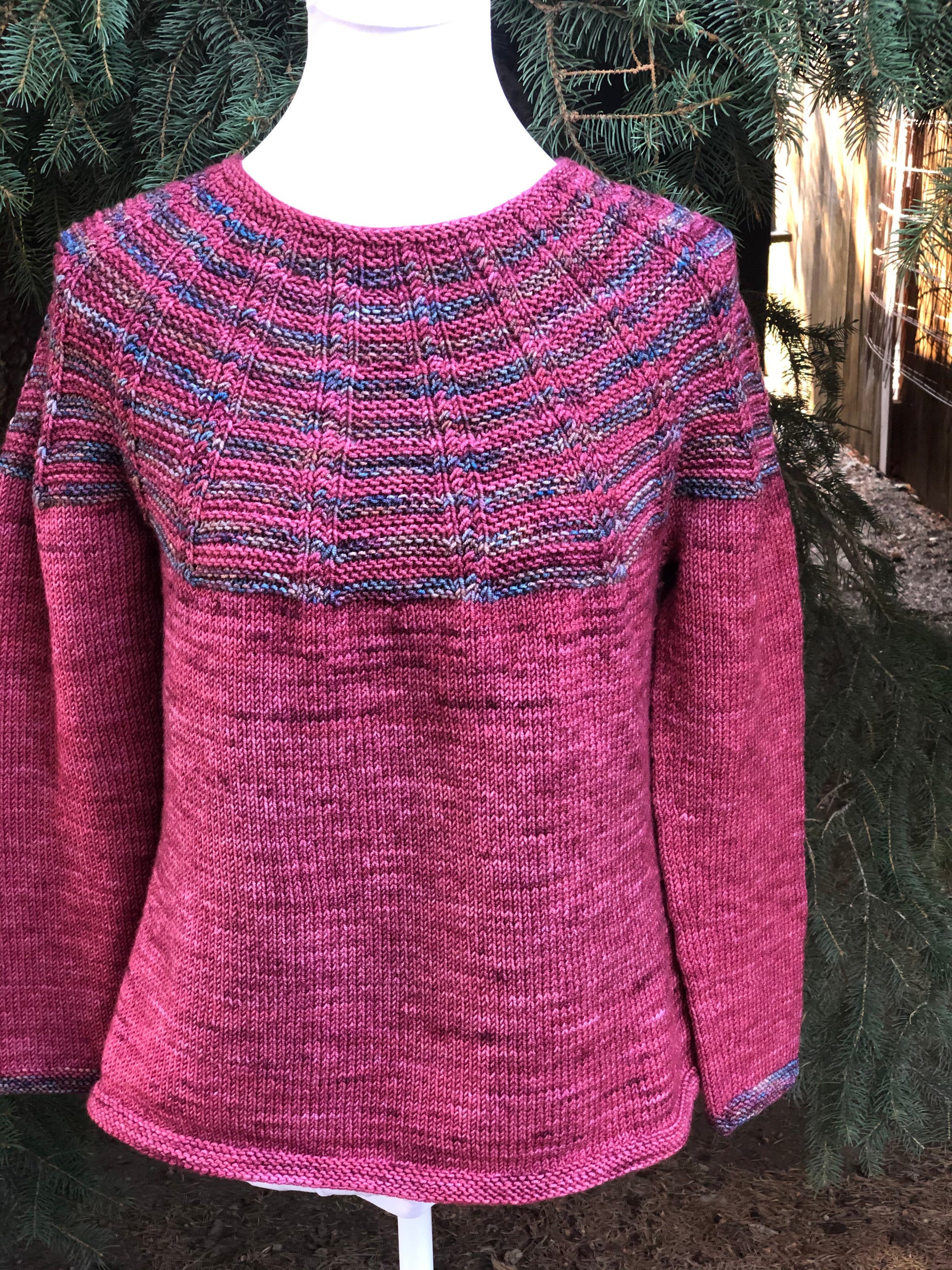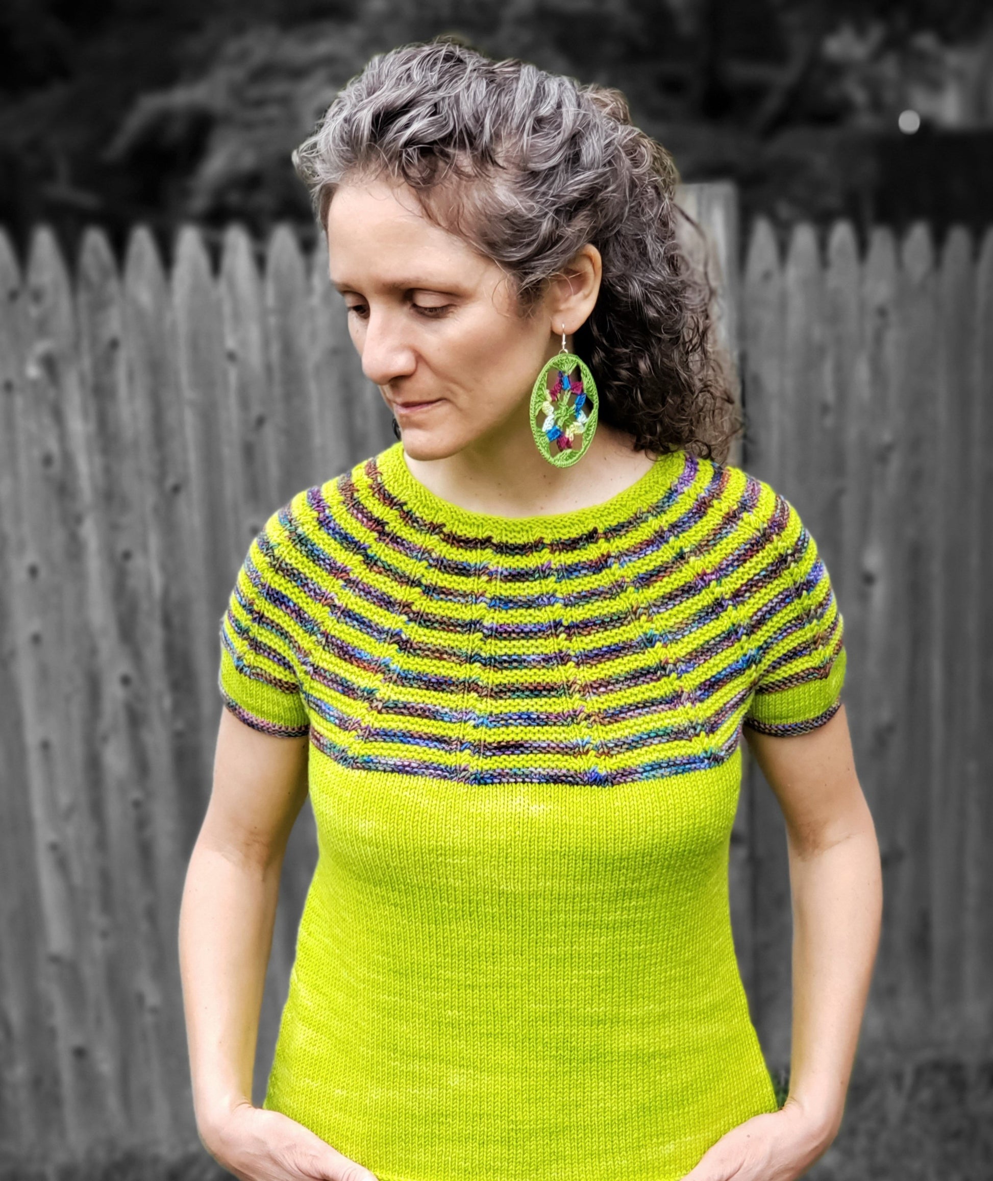 Variation on a Twist is a top down, short-sleeved pullover with gentle waist shaping that leads to a slight A-line silhouette. A long-sleeve option is also included in the pattern.