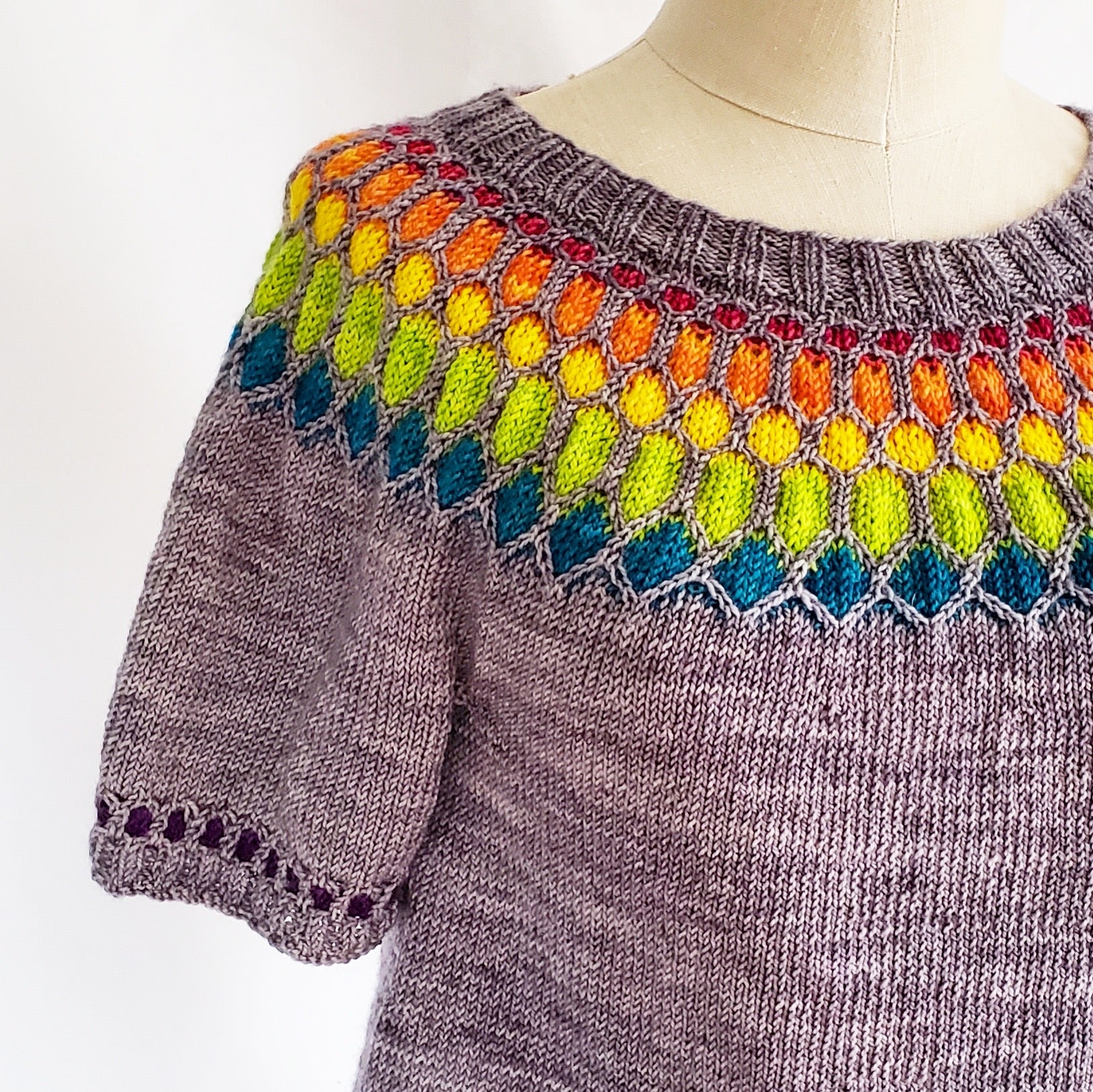 Twice Again is a fingering weight top-down, short-sleeved, cropped pullover sweater; knit in-the-round with a stranded yoke that is coupled with simple cable stitches. It is a fingering weight version of the popular DK weight Once Again sweater.