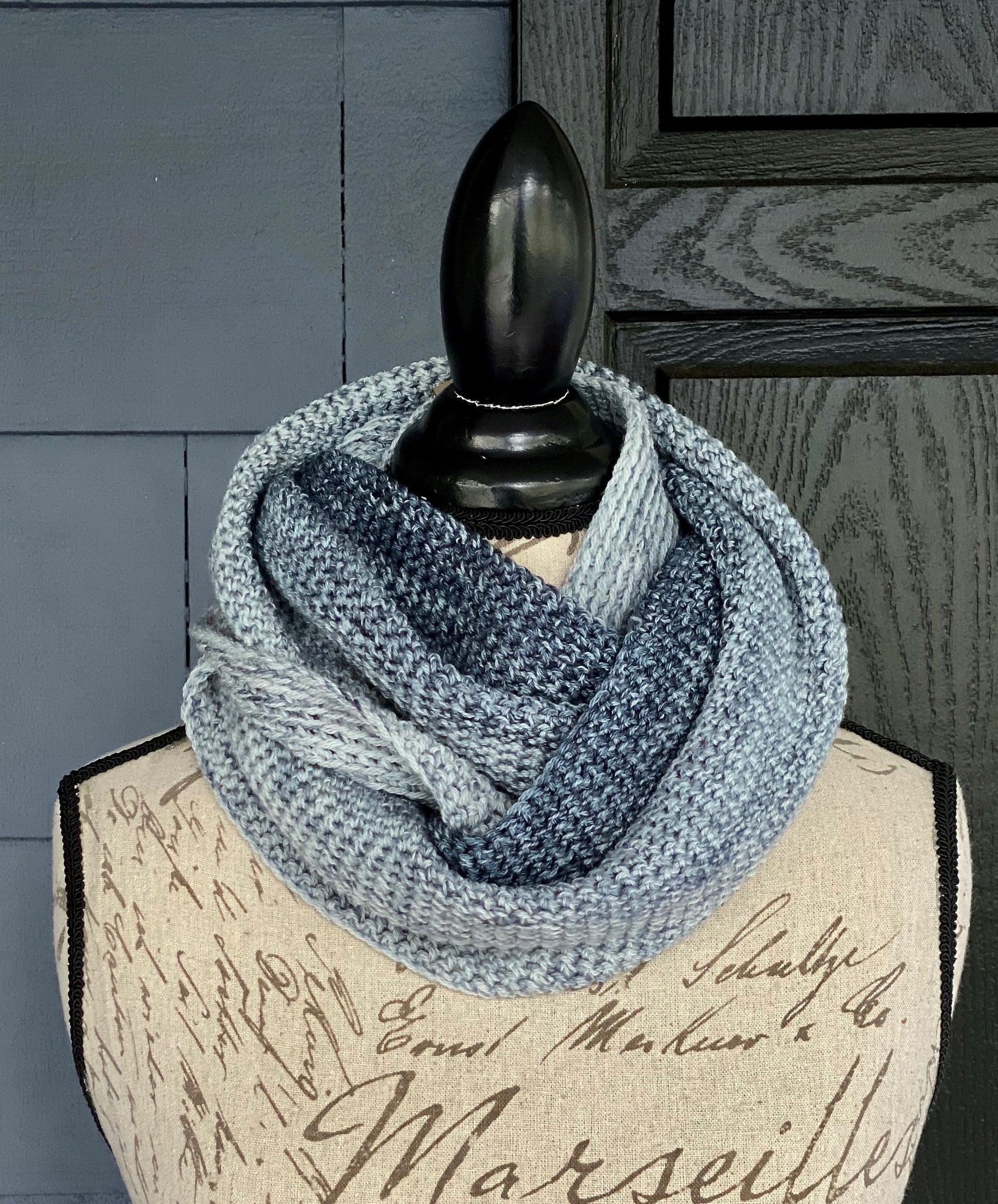 Ava’s Cowl is a simple crocheted cowl which derives its understated elegance from a beautiful texture and a subtle shifting of color. The lovely fabric is created by working single crochet into the back loop. And the gorgeous ombré is achieved by gradually changing one of four strands of yarn being held as the piece is crocheted. The overall effect is a timeless, eye- catching cowl that is also utterly compelling to crochet!