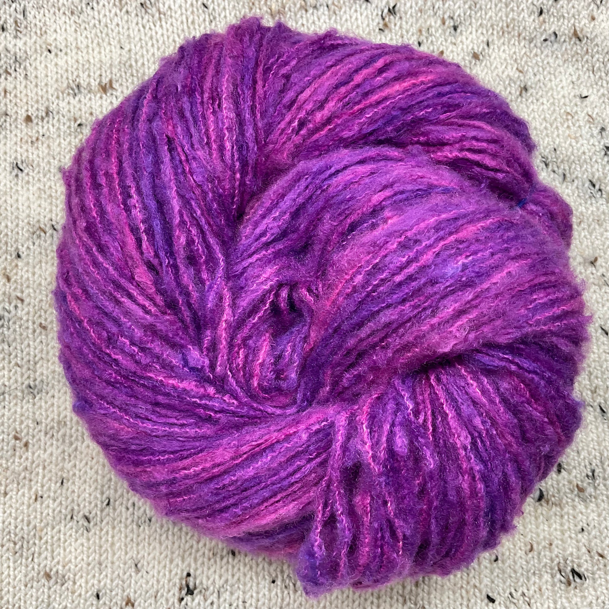 This is a single ply silky boucle with a soft muted fluff. It knits up chenille-like in texture resulting in a soft and drapey fabric.