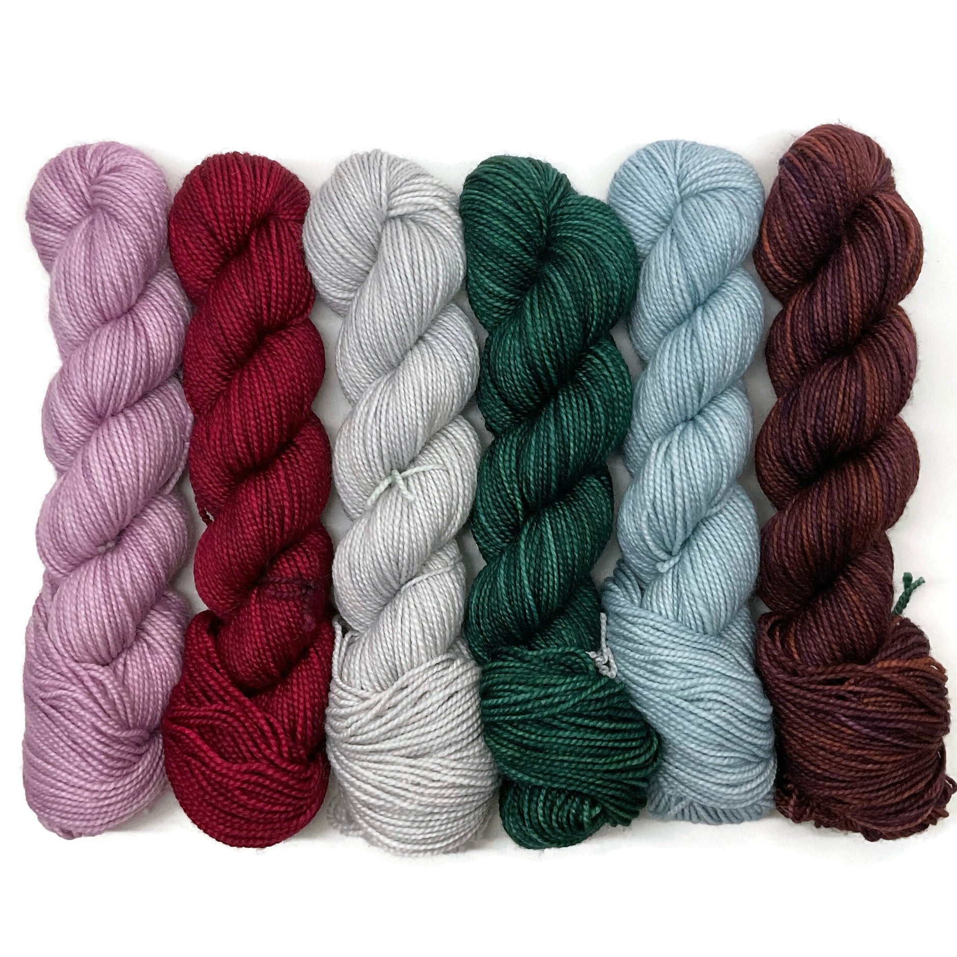 The set includes six mini skeins 133 yards each in fingering weight - 80% Superwash Merino / 10% Cashmere / 10% Nylon to knit the shawl as shown. The pattern is not included.
