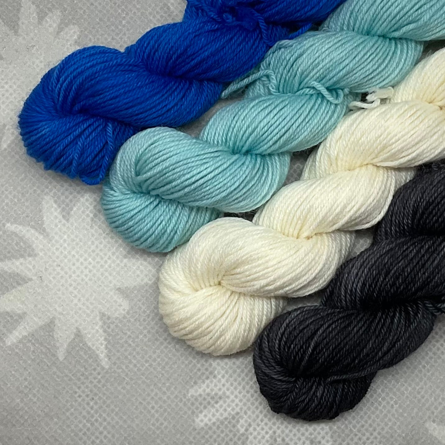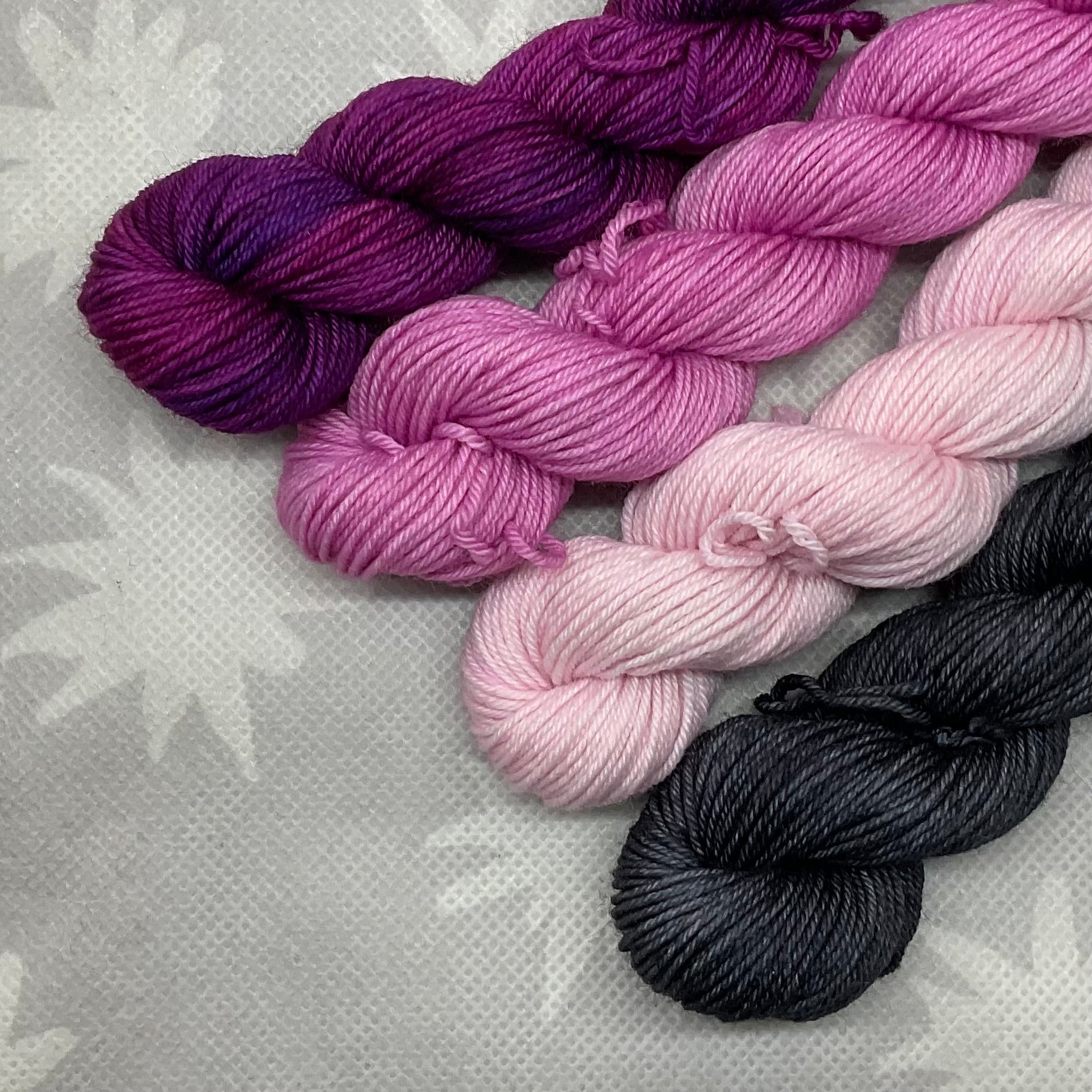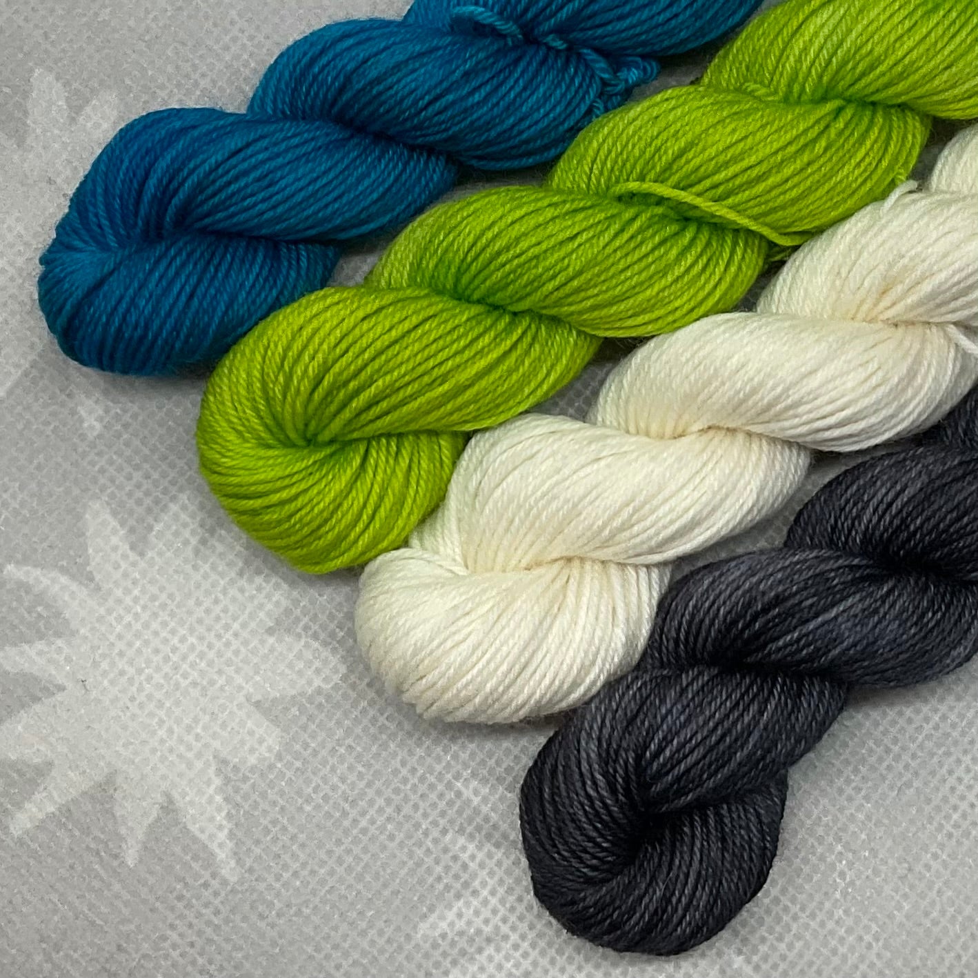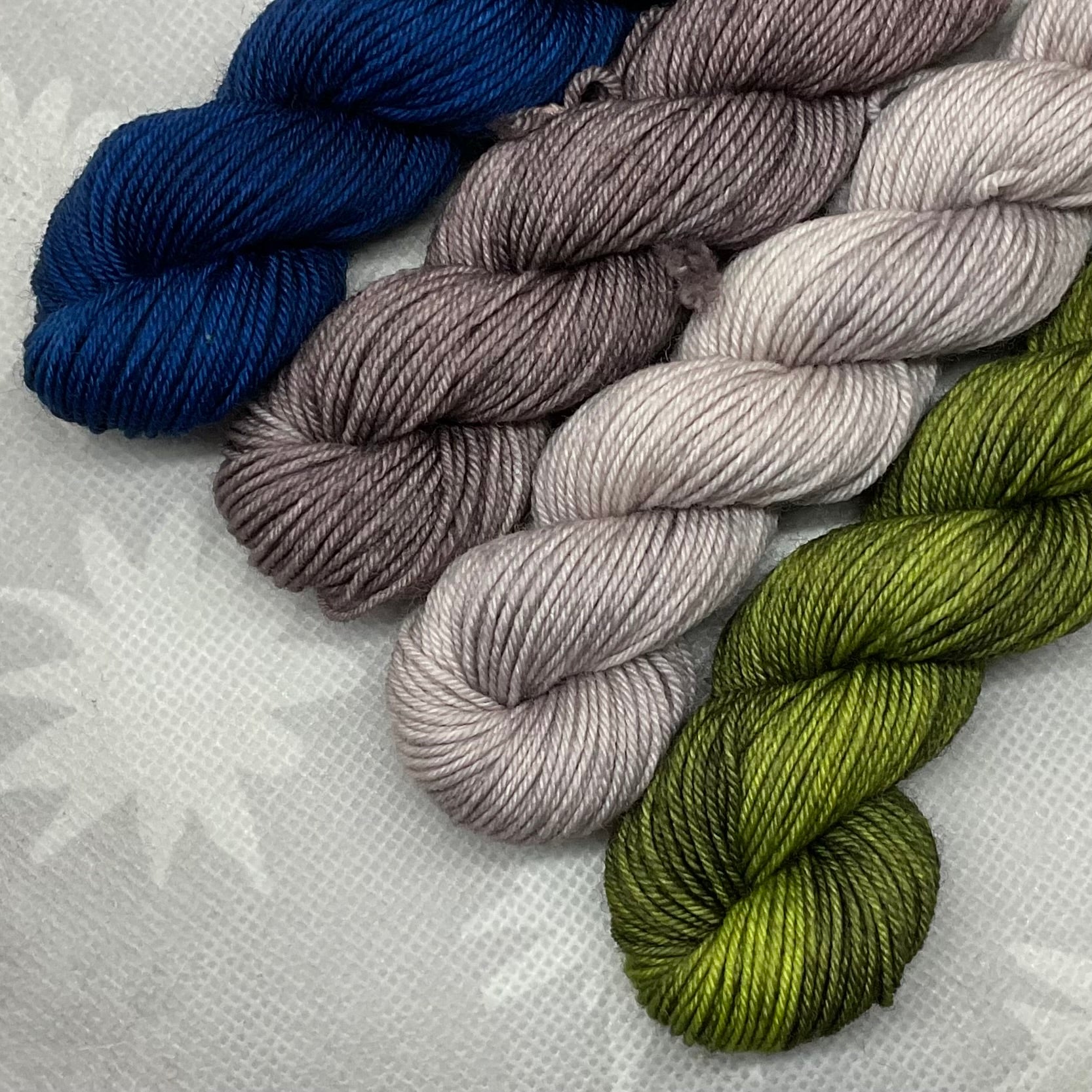 - Four Venti Mini skeins of hand dyed yarn - 75% Superwash Merino / 25% Nylon. Approx 20g / 90+ yards each