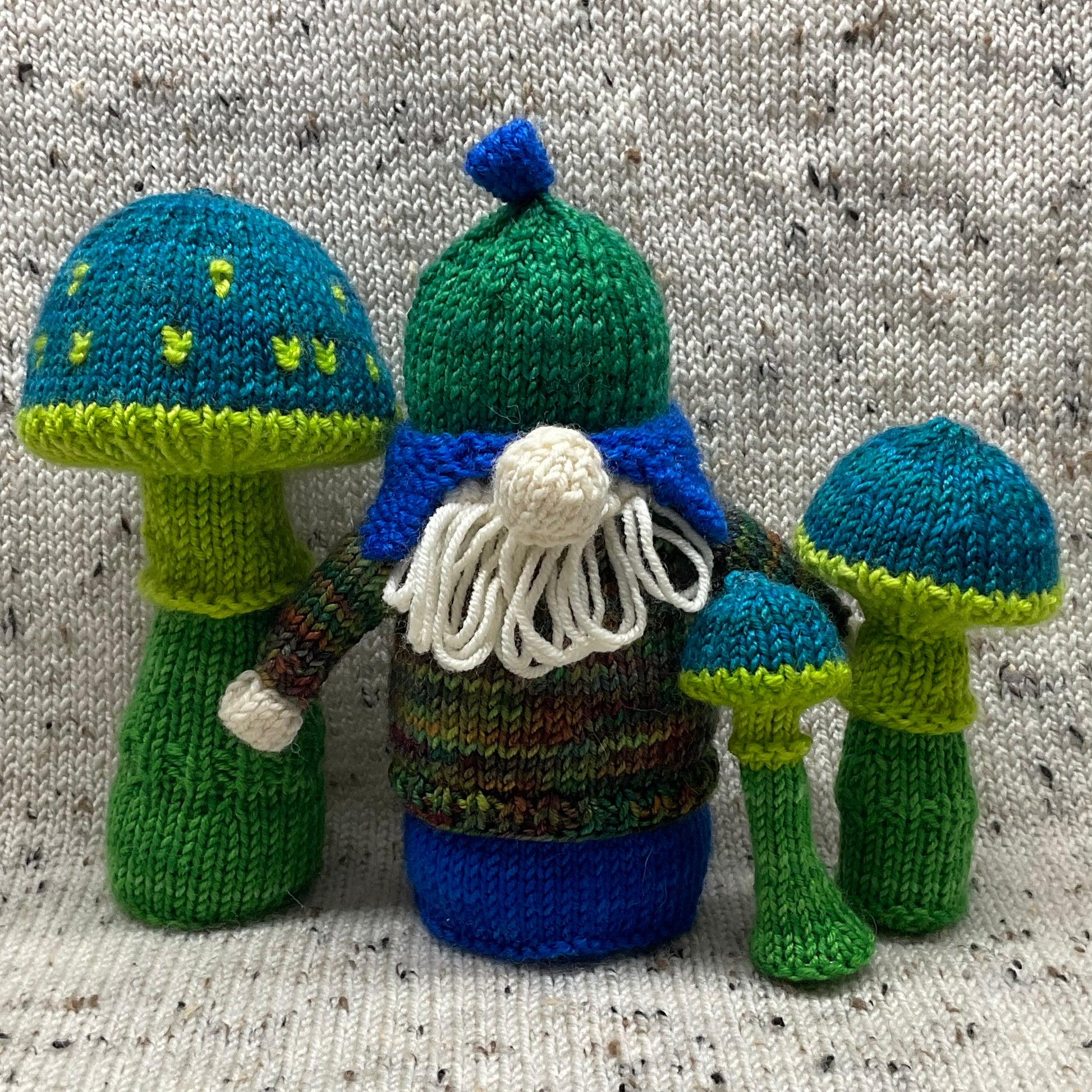 The last photo features Gnoddy knit in DK using the limited edition set What a Wonderful World. She’s standing amongst a Wee Mushroom Trio.