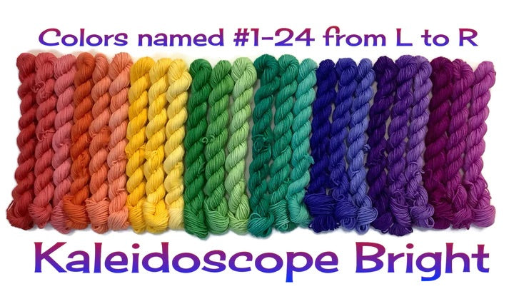 - one full set of Kaleidoscope Bright Lynnette minis (fingering weight) - 24 mini skeins approx 46 yards each in Practicality 75/25