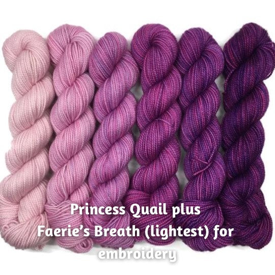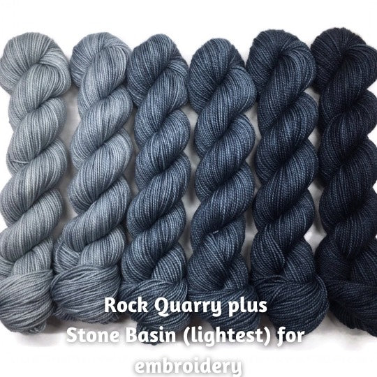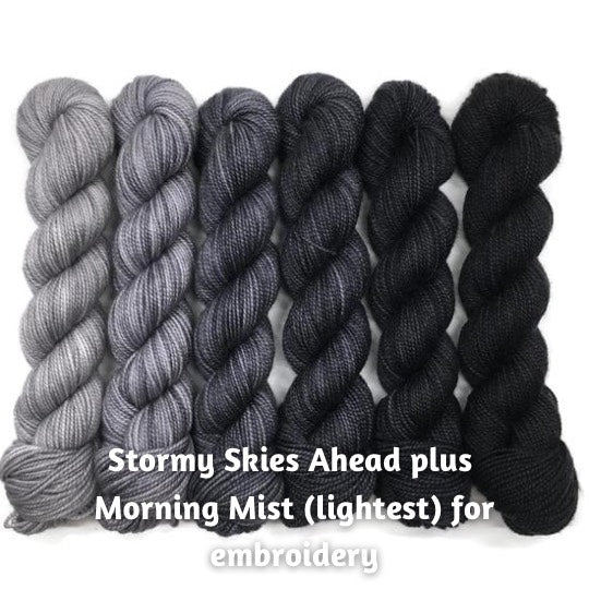 The third photo is 2 skeins of Amethyst Playtime DK for the cowl and 1 skein of Stone Basin Playtime DK for the embroidery
