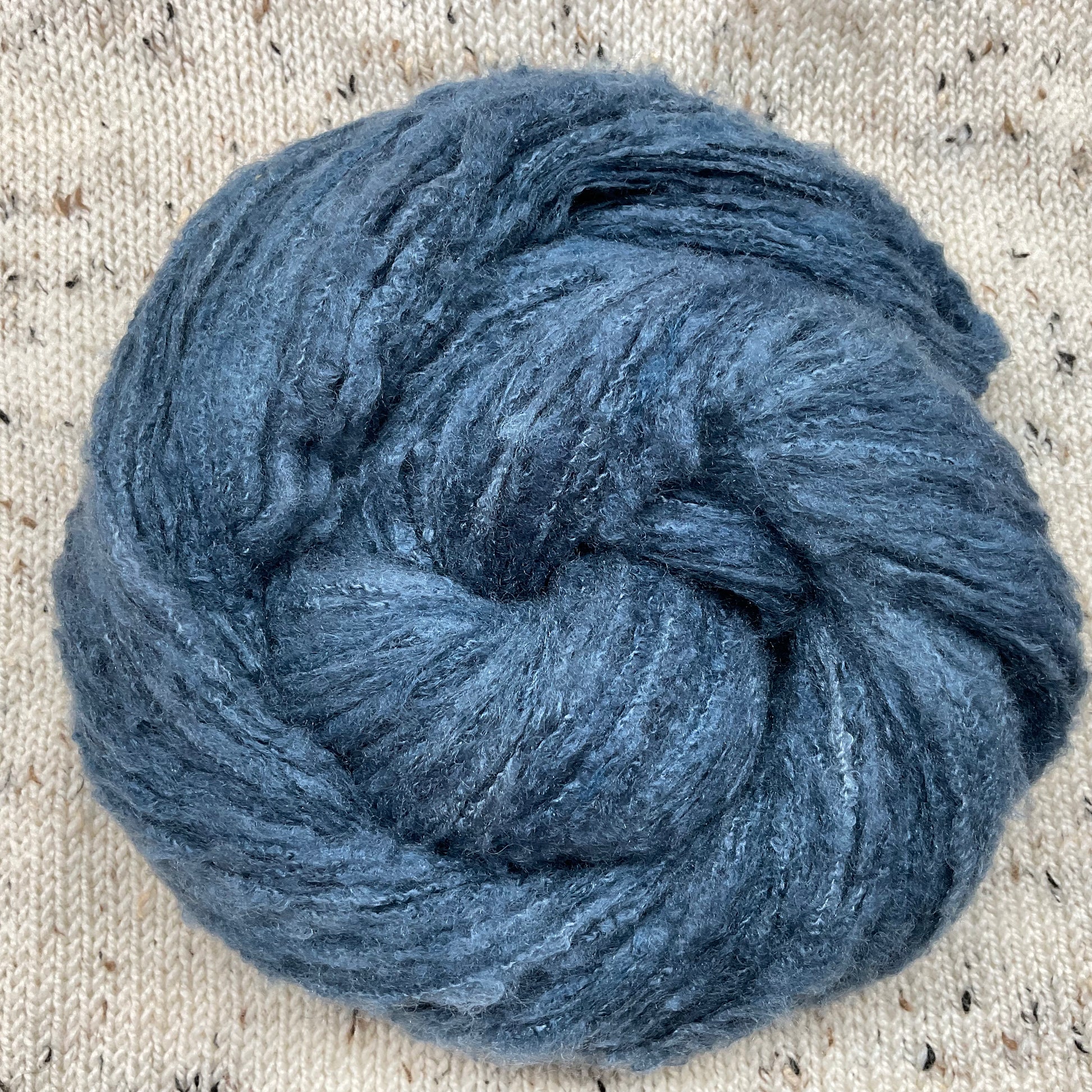 This is a single ply silky boucle with a soft muted fluff. It knits up chenille-like in texture resulting in a soft and drapey fabric.