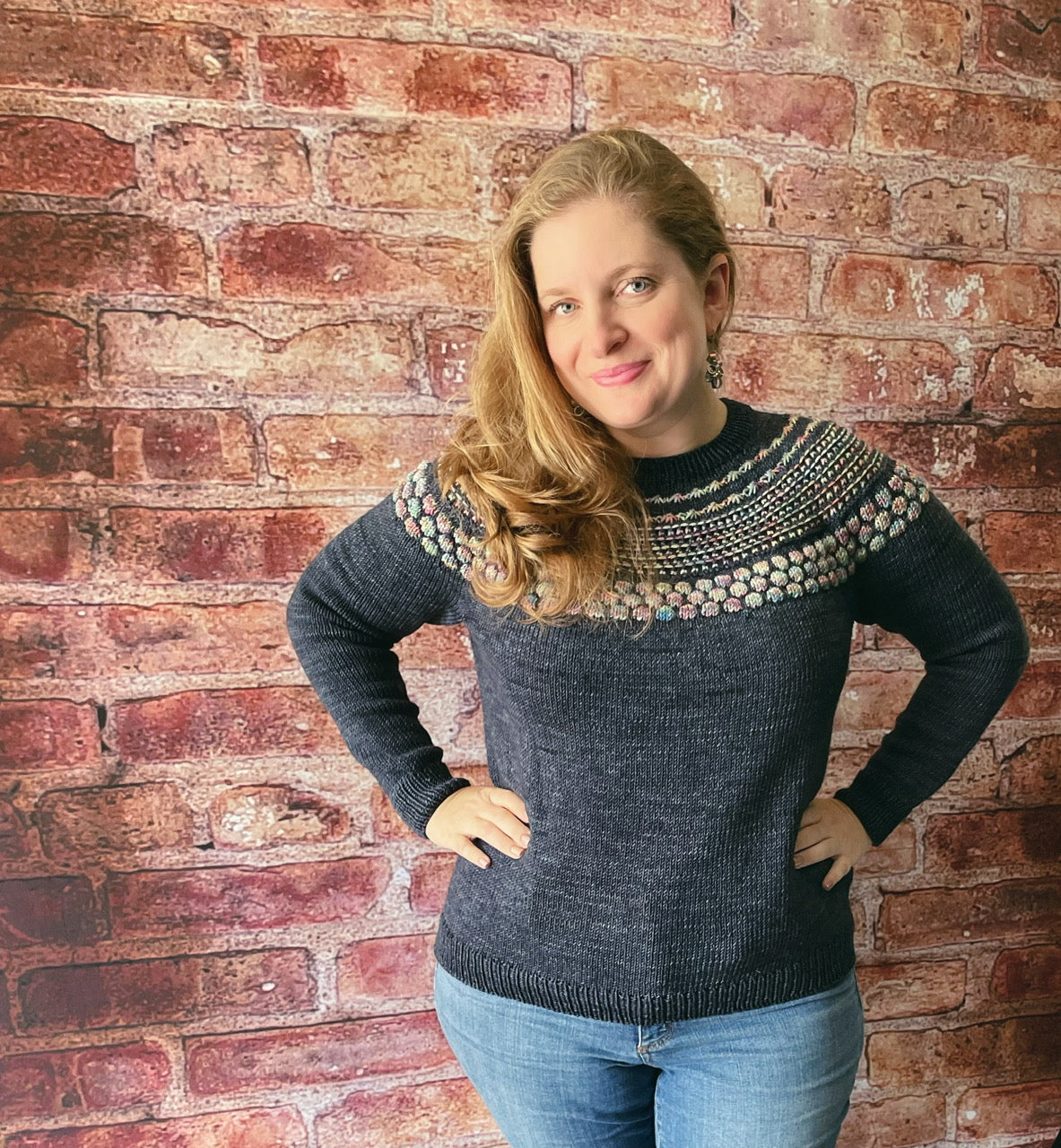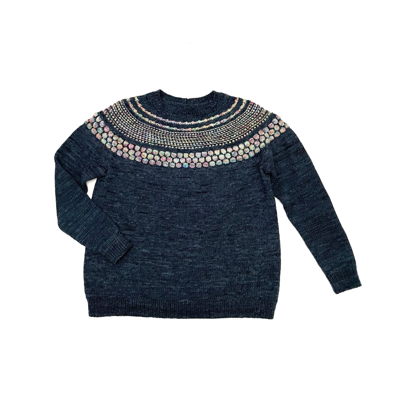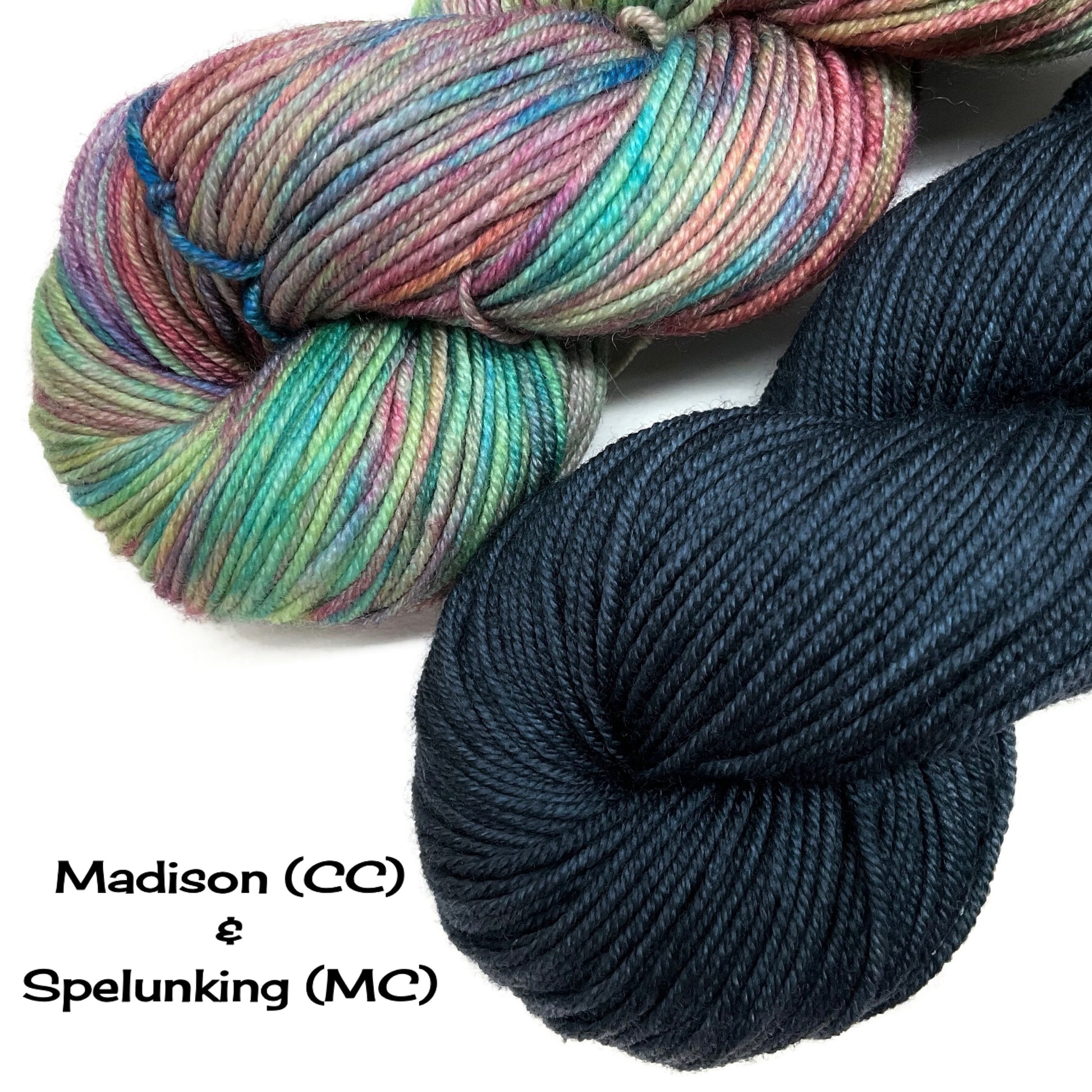The sweater shown is in Spelunking as the Main Color and Madison as the Contrasting Color.