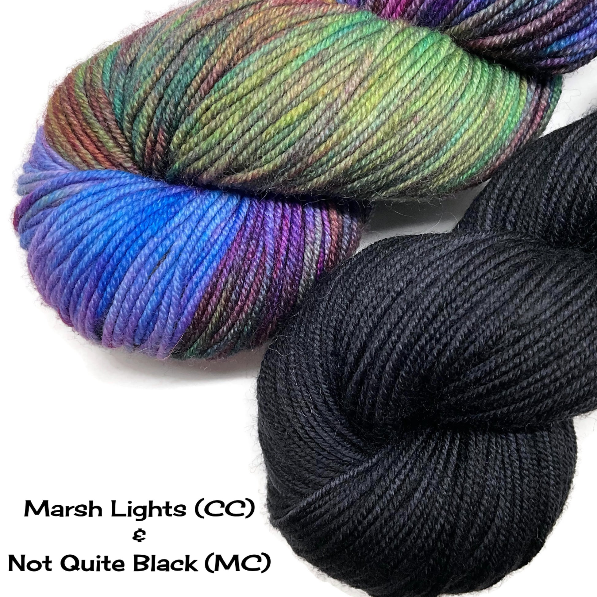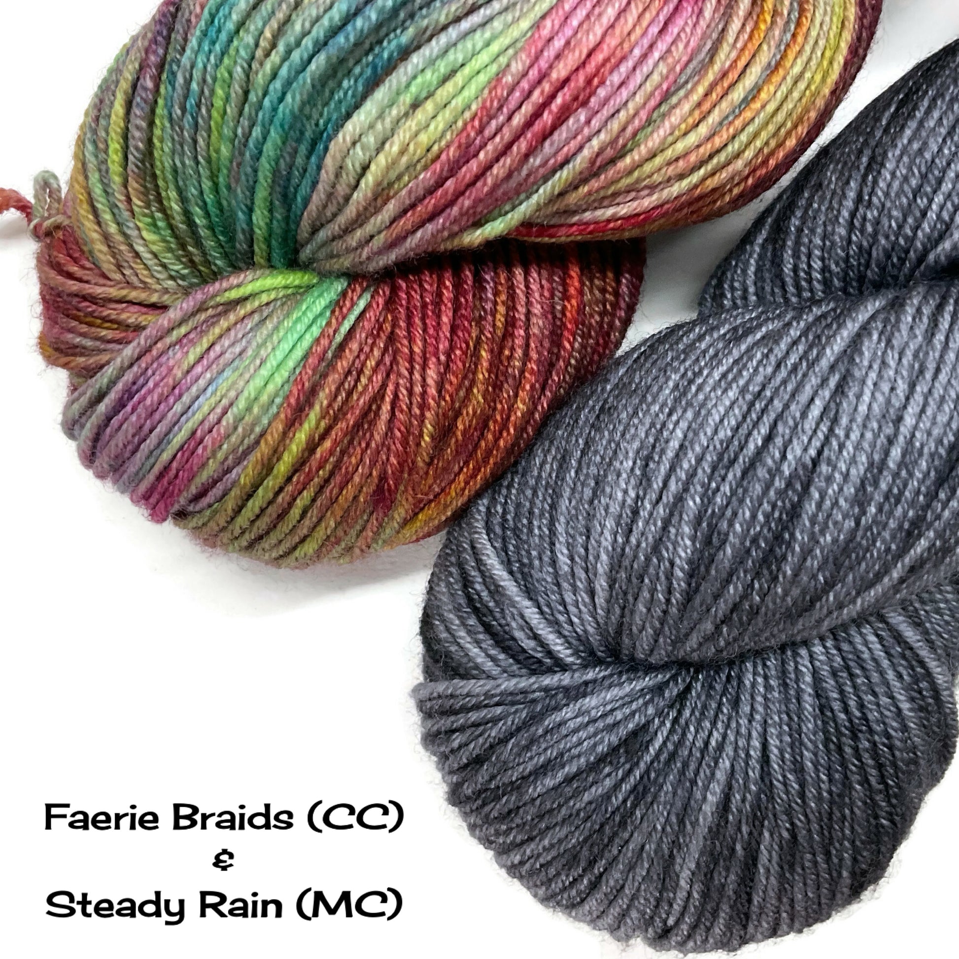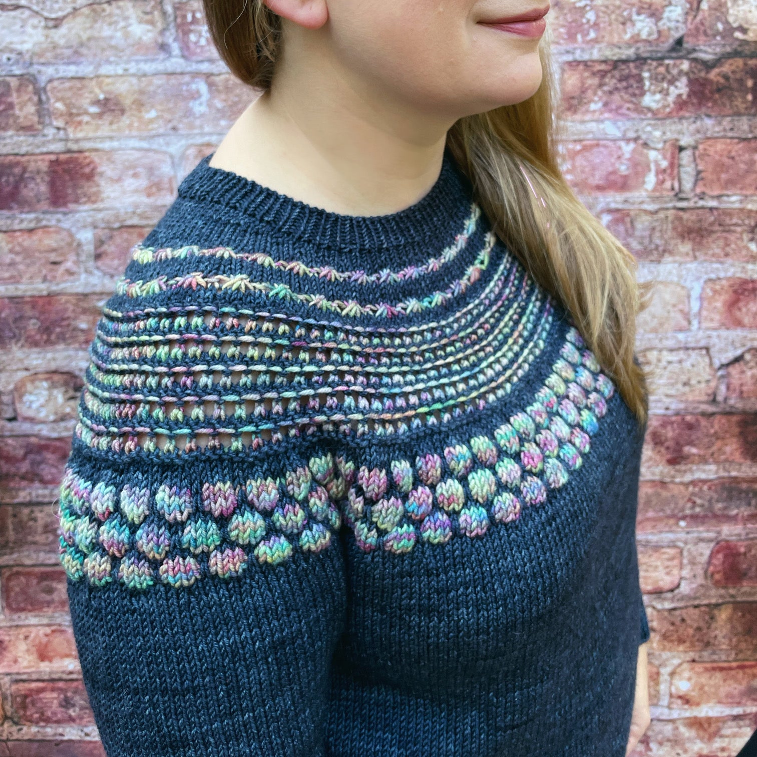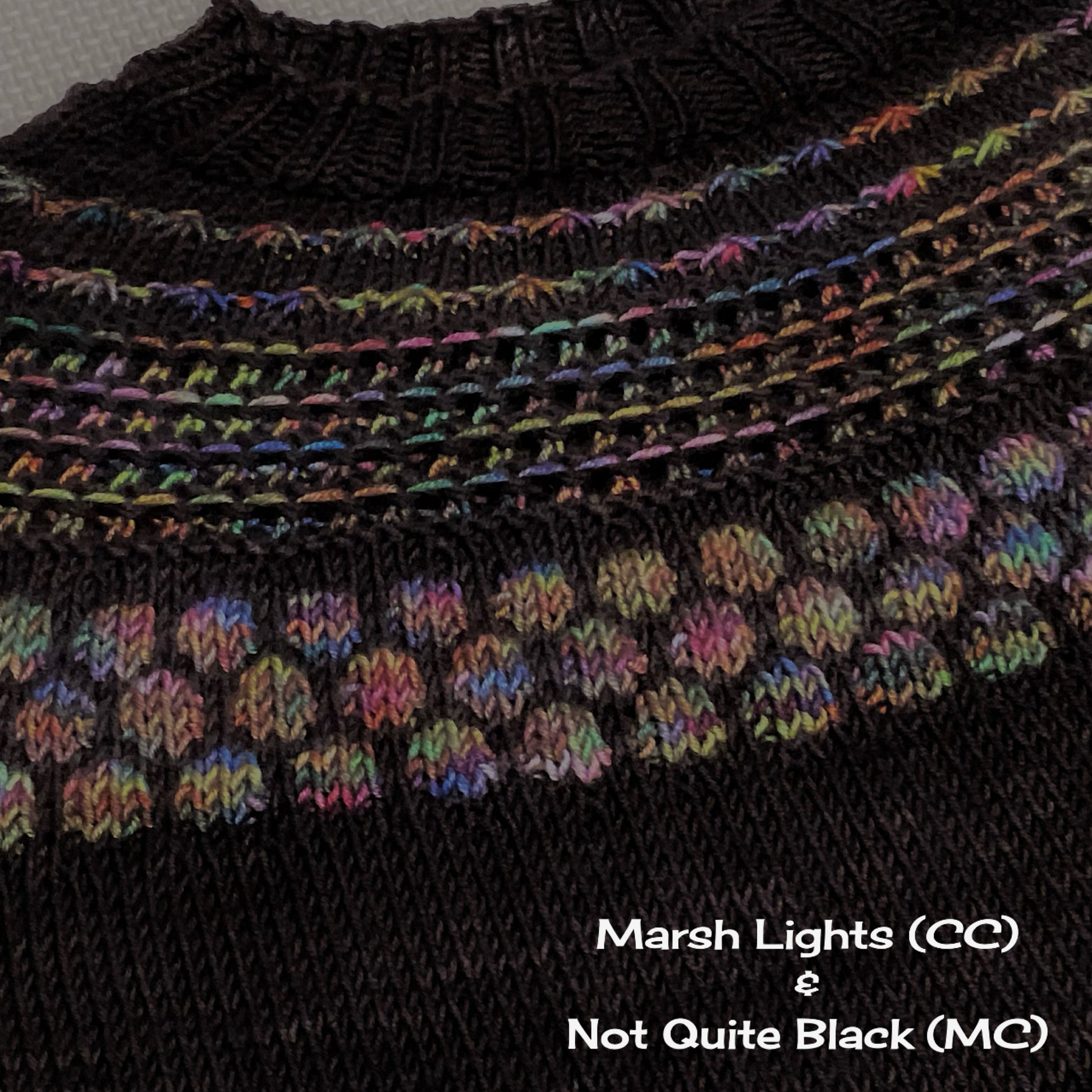 The sweater shown is in Spelunking as the Main Color and Madison as the Contrasting Color.