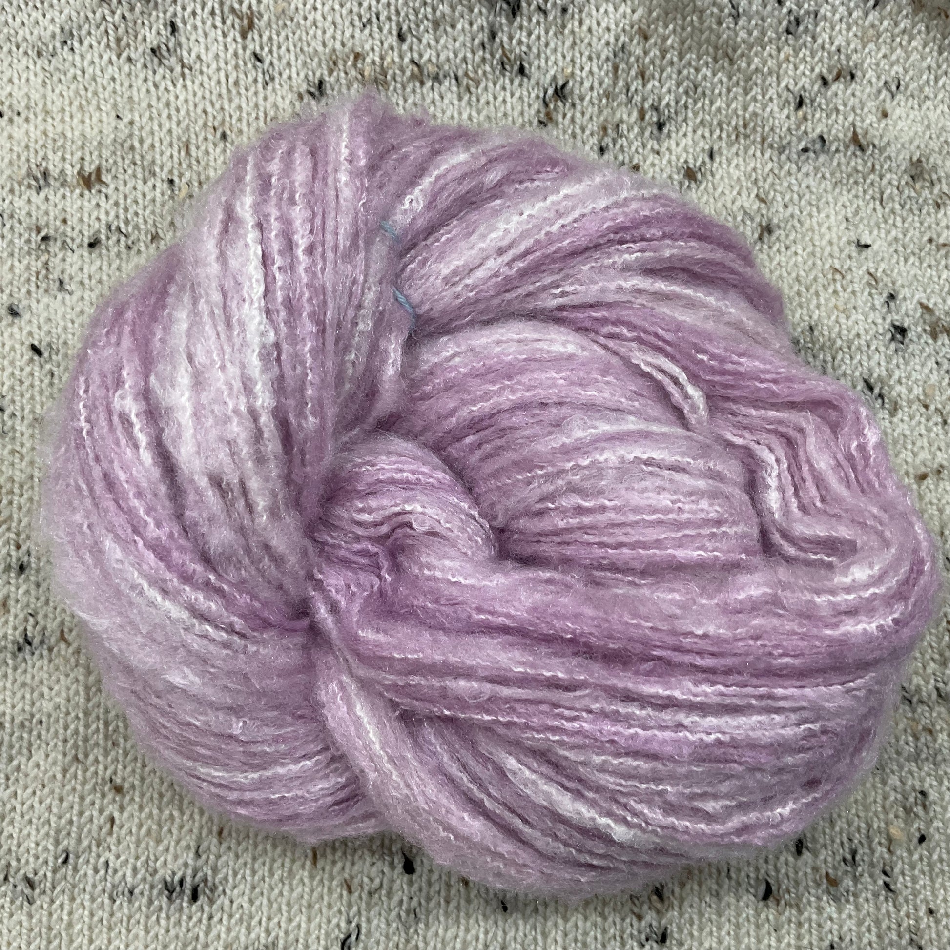 This is a single ply silky boucle with a soft muted fluff. It knits up chenille-like in texture resulting in a soft and drapey fabric.