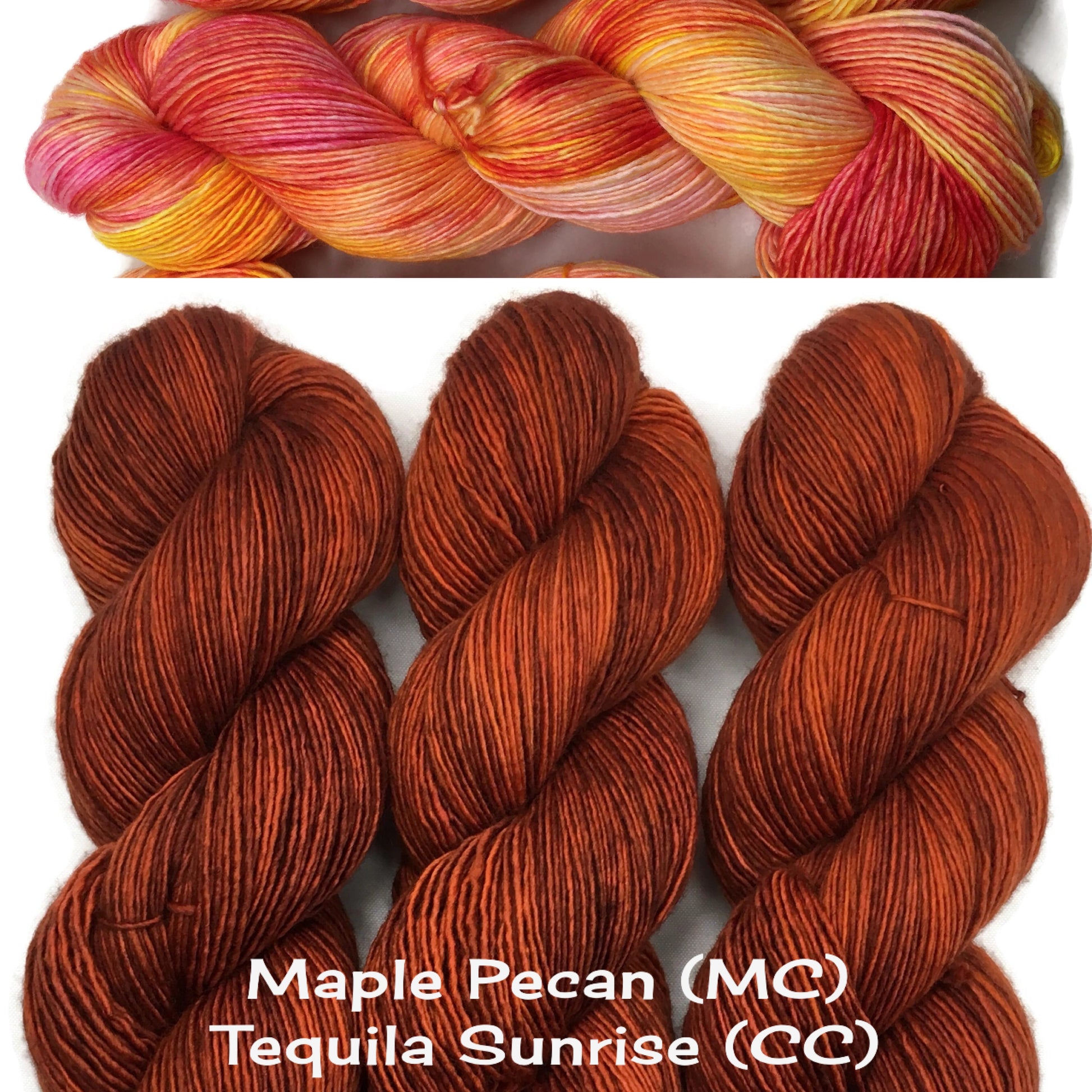 The sample shown is knit in Quintessa Fingering in the colors Maple Pecan (MC) and Tequila Sunrise (CC)